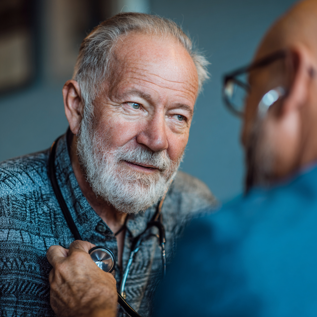 73-year-old male, AF, previous stroke, hypertension, high fall risk, osteoporosis, post left hip replacement, lives alone, no ACD or POA, post-TURP urinary incontinence from BPH, low mood, overdue vaccinations and screening
